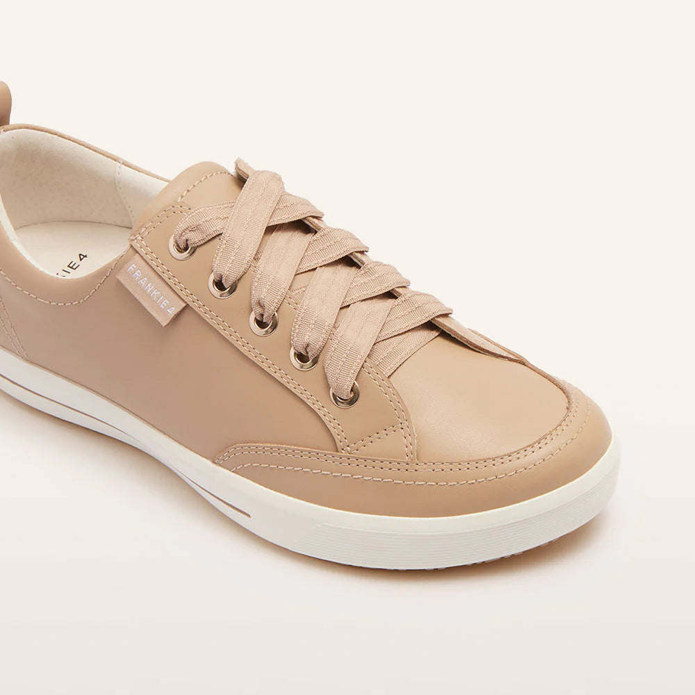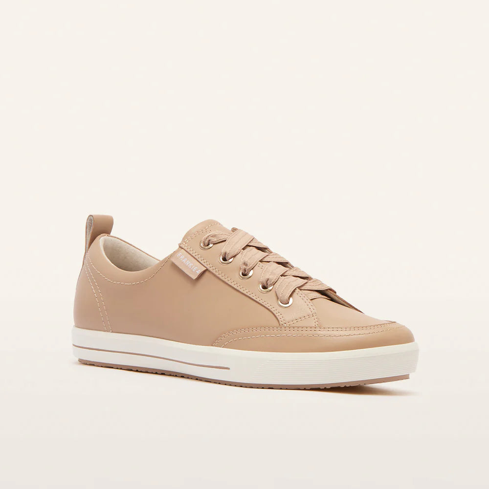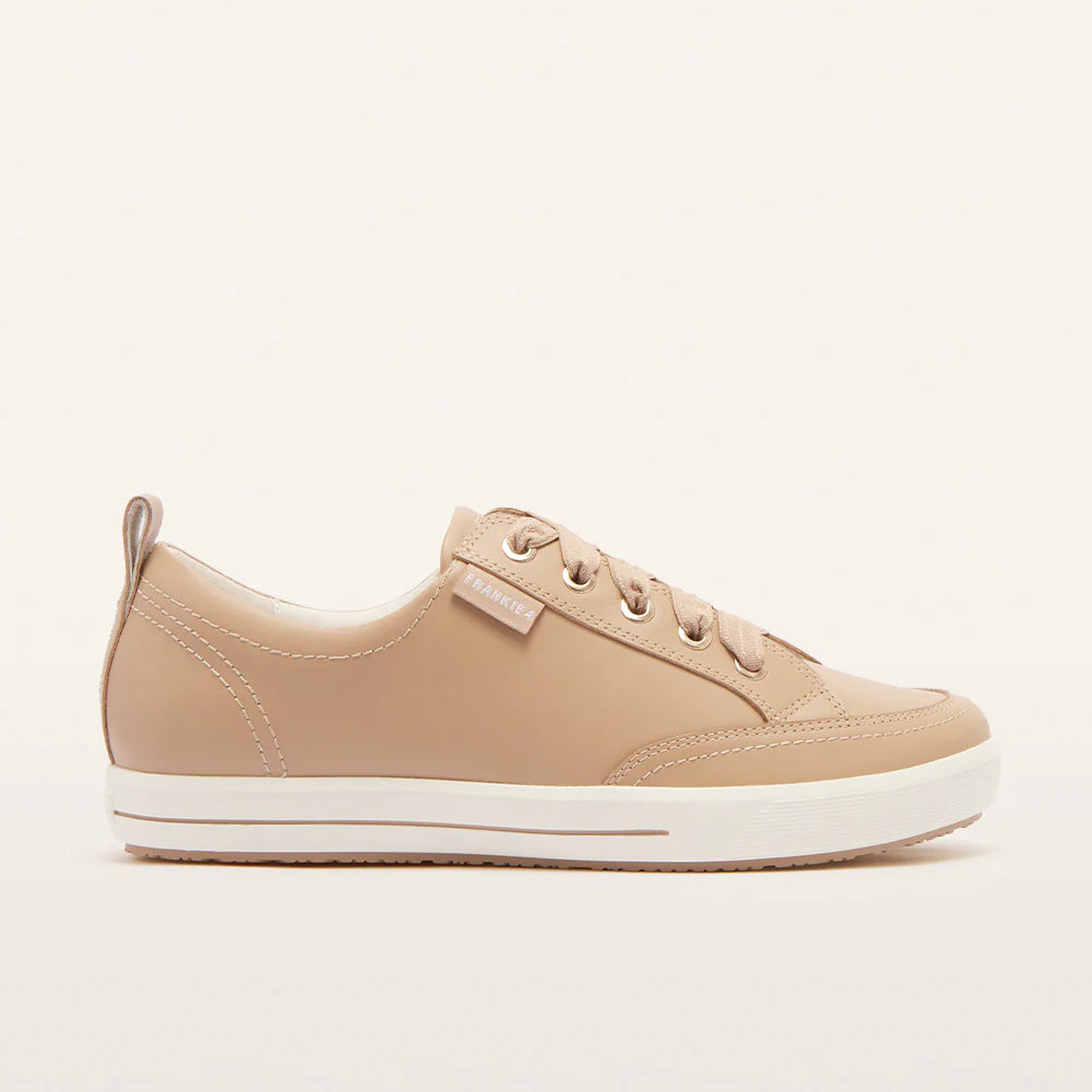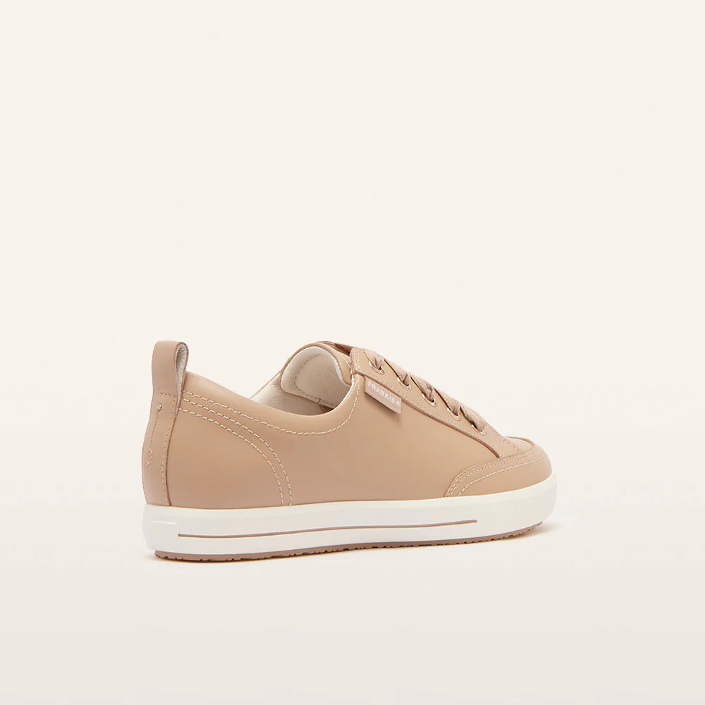Upgrade your daily essentials with Ellie in neutral Sand. This refreshed favourite maintains the same fit and feel you love but with a slightly softened toe for a contemporary touch. Featuring jacquard-weave ribbon laces and additional recycled cotton laces provided for versatile styling, Ellie is a mainstay with true versatility. With a triple-layer support and cushion system, custom fit options, and podiatrist-designed footbed technology, Ellie combines classic style with all-day comfort and is also ideal for on-the-go days. Handcrafted leather and eye-catching sole details complete the look.