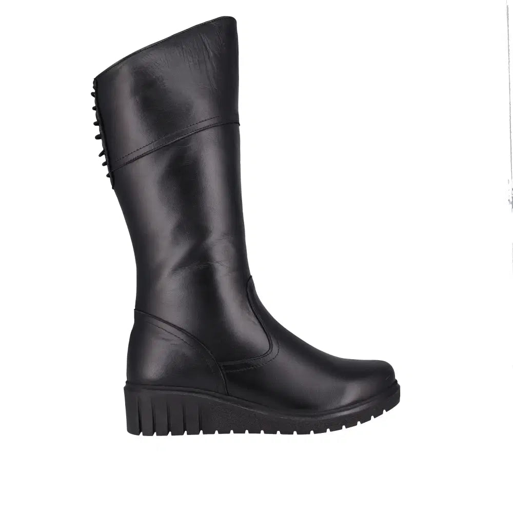 Engage is the essential long boot for winter. Designed with a wedge heel and a higher front upper, it comfortably accommodates wide calves, while elastic laces at the back ensure a perfect fit. A full-length side zip provides easy on-and-off access, and the removable insole allows for orthotic use. Available in classic black and tan, Engage is a stylish and practical winter favourite.