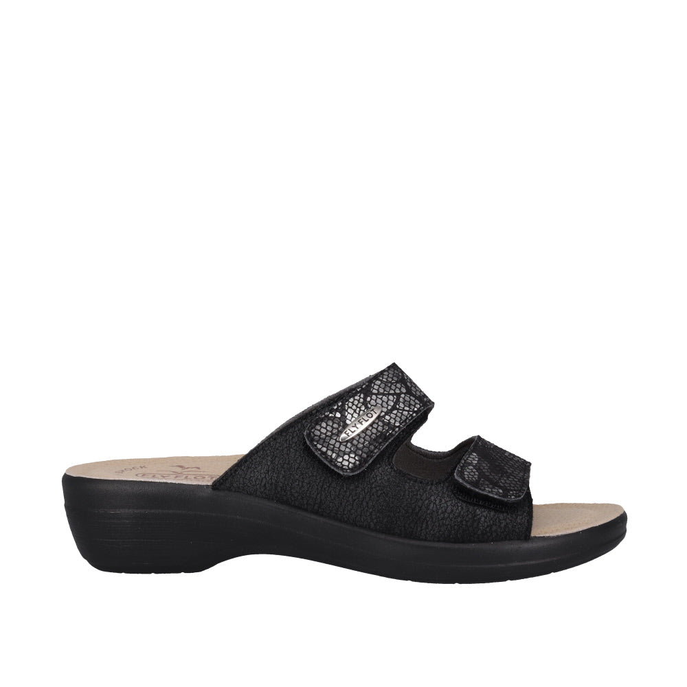 The Fly Flot T5B18 53 is a beautiful slip-on sandal with a soft decorative print upper and cushioned leather insole. With a low wedge allowing for day or night wear.